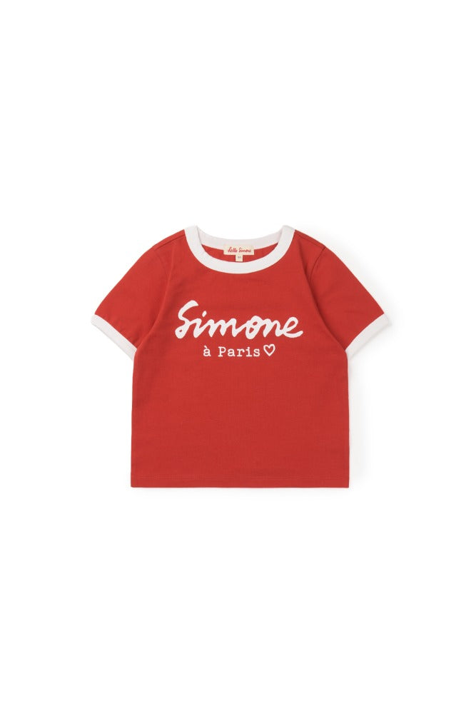 파리지앵 감성을 담은 Simone à Paris 레터링이 돋보이는 스판성이 좋은 반팔 티셔츠입니다. 컬러 포인트가 살아 있는 링거 디테일로 데일리 룩에 사랑스러운 활기를 더해줍니다. Made in china제품 내 케어라벨 참고 : 기계 세탁 시 찬물 사용, 건조기 사용 금지
