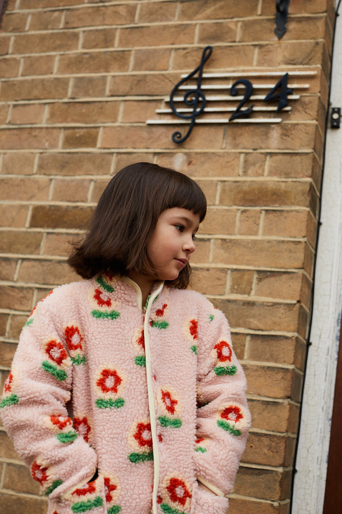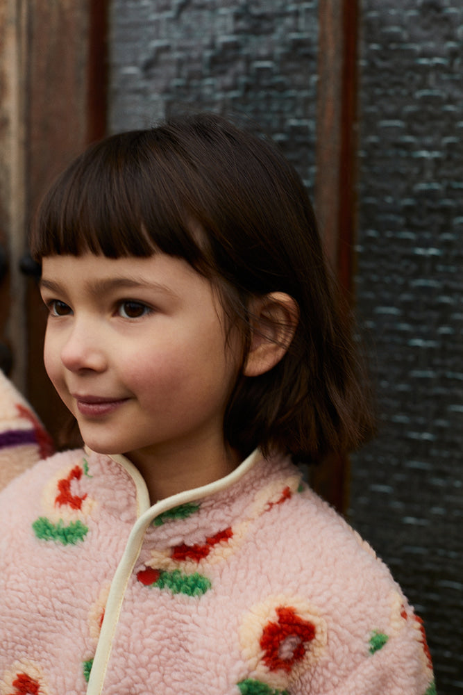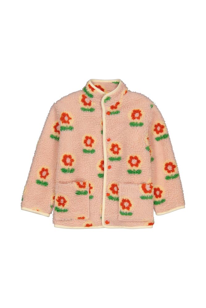 전체적으로 패턴이 들어간 플리스 소재의 자켓입니다. 폴리에스터와 면 혼방으로 제작되었습니다. Made in China.