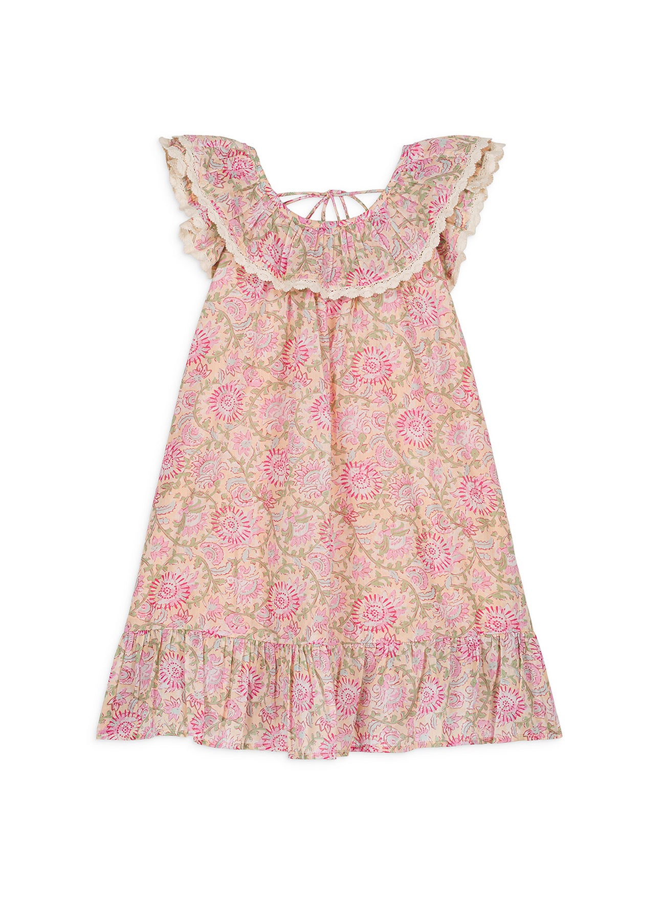 우리가 좋아하는 디테일:· 플로럴 코튼 보일 드레스, 안감 처리 완료· 레이스 엣지가 있는 짧은 러플 소매· 레이스 엣지가 있는 러플 네크라인· 러플과 레이스 엣지가 있는 깊게 파인 뒷면· 뒷면 작은 리본 디테일로 잠금· 밑단 큰 러플 디테일* 참고: 3세 이하 사이즈는 뒷면이 노출되지 않고, 상단에서 하단까지 버튼으로 잠겨 있습니다.물 온도 30°C 로 약하게 세탁표백 금지기계건조 금지낮은 온도로 다림질드라이클리닝화기에 가까지 하지 말 것