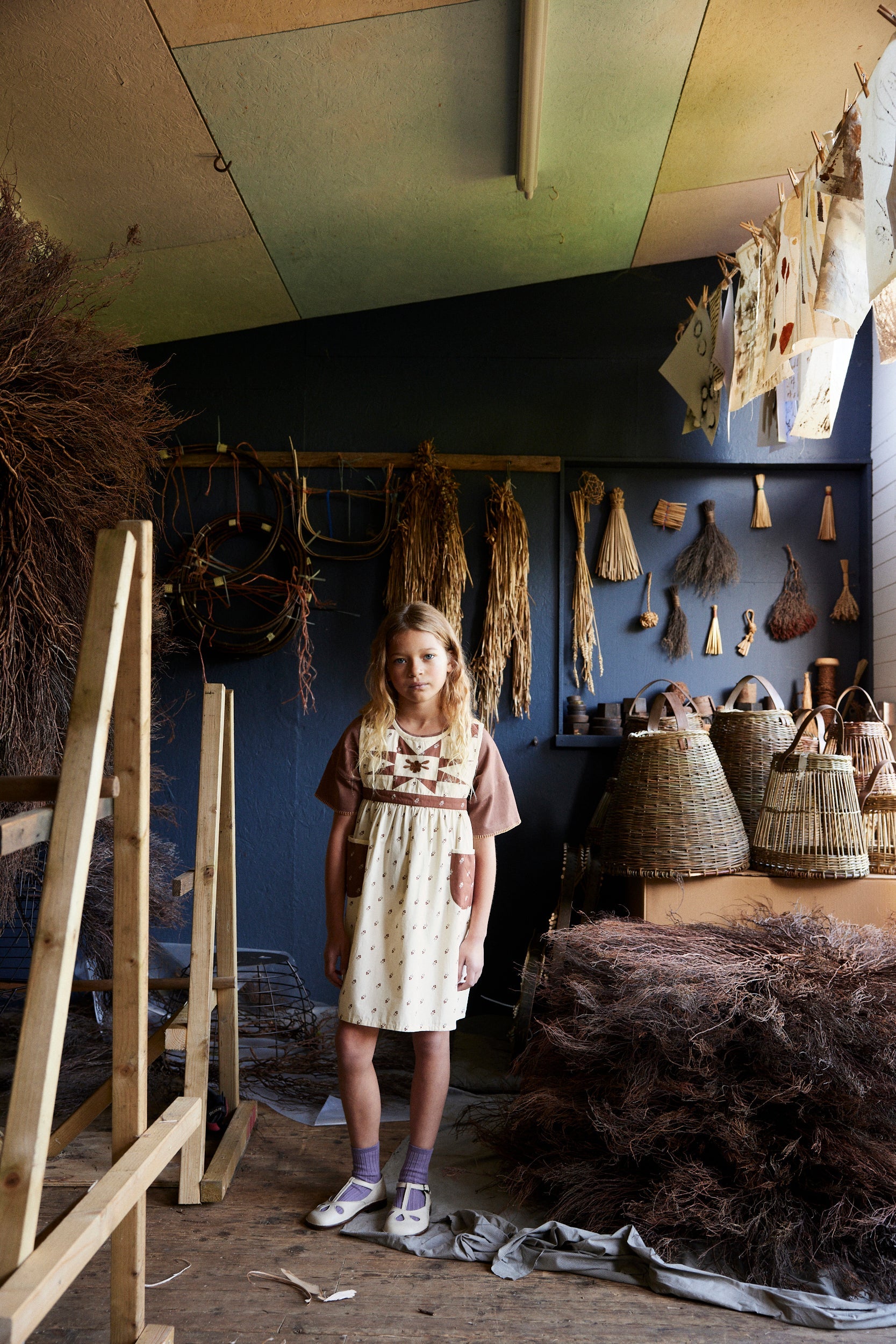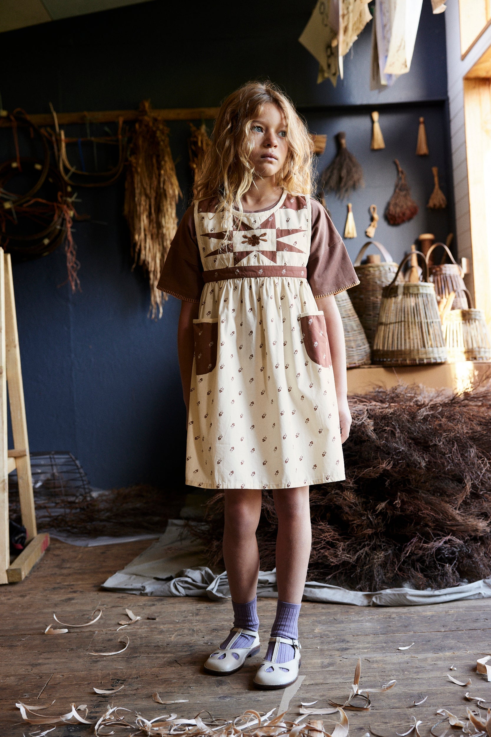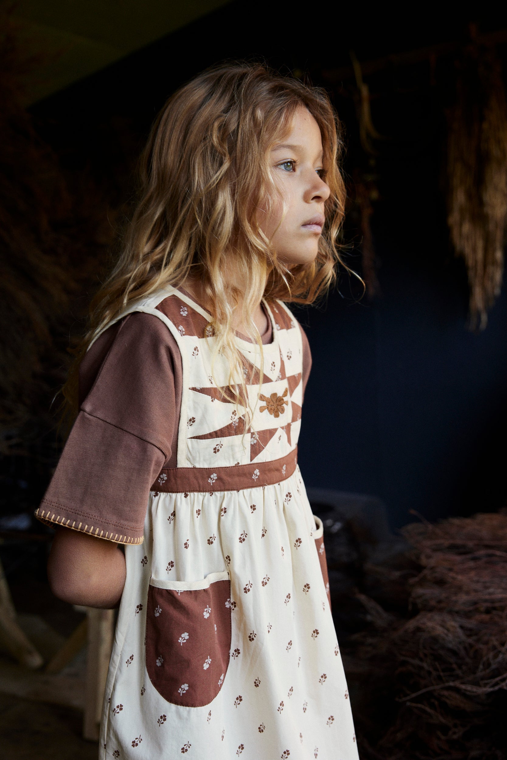 The prettiest vintage-inspired pinafore, with cute retro proportions. This patchwork Bibi is inspired by our earliest patchwork piece back in 2018. She has been reinterpreted into the original chocolate and milk colourway of our signature prairie print. Bibi is a relaxed fit to allow for layering which gives her possibility for year round wear. Back neckline button and zip at back waist. 100% Cotton Ethically made in India Hand wash recommended 2-3 years. Dress length is 49cm. 3-5 years. Dress length is 55cm. 5-7 years. Dress length is 61cm. 7-9 years. Dress length is 70cm. 9-11 years. Dress length is 77cm *Elsie in the studio shoot imagery is 129cm tall and wearing 7-9y sample