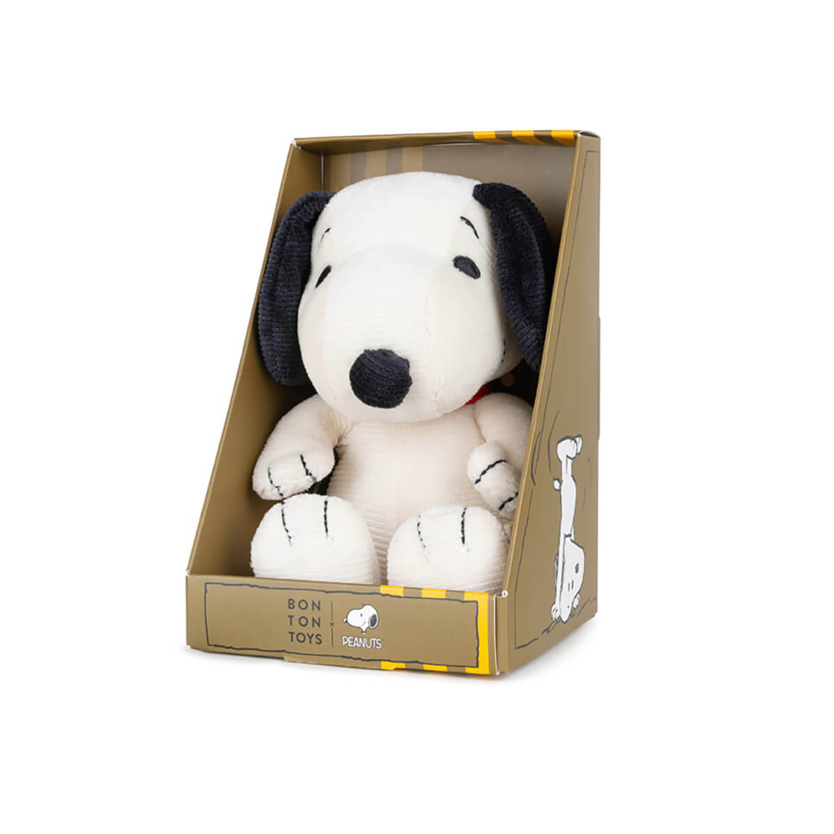 Snoopy toy by Bon Ton Toys. We have adopted a little Beagle called Snoopy and his little yellow friend Woodstock. Corduroy Snoopy in a gift box. All Peanuts plush items are hand made and contain 100% recycled polyester filling. All our suppliers are carefully selected and all meet the “ethical supply chain” (ICTI) status.Bon Ton Toys is an internationally renowned supplier of high-quality soft and plush toys established in 1933. All their toys meet the very highest quality, safety and regulatory standards. 7" / 17cm tall. Colour: Cream. 100% Polyester. CE Certified. Suitable for ages 3+. Product code 3317701
