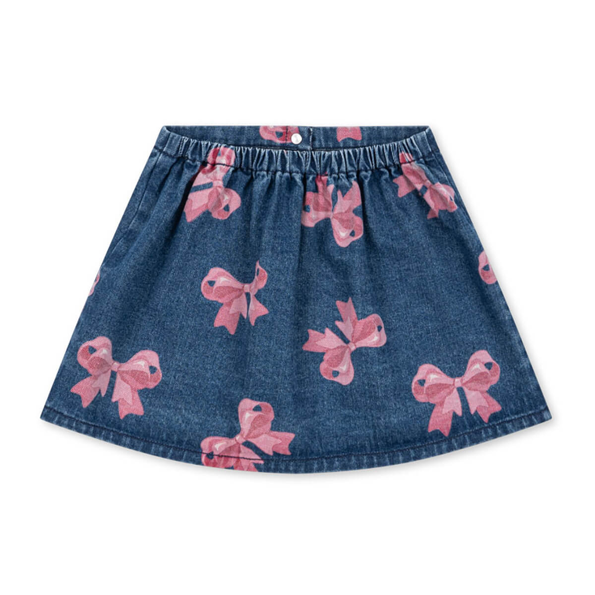 Magot Skirt by Konges Slojd. Short denim skirt with an all over bow print. Colour - Bella Bow. 100% Organic Cotton. Style Code: KS102283