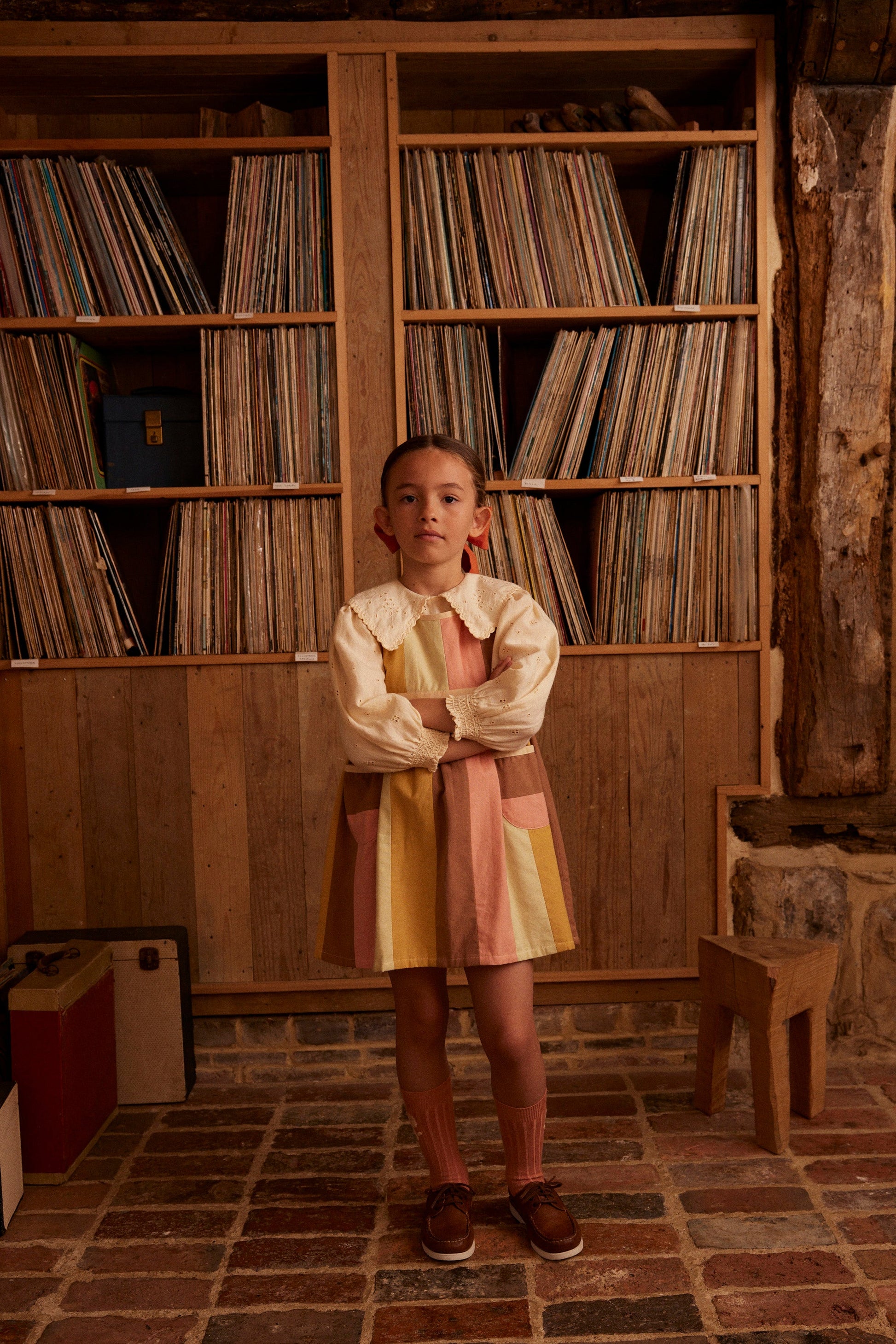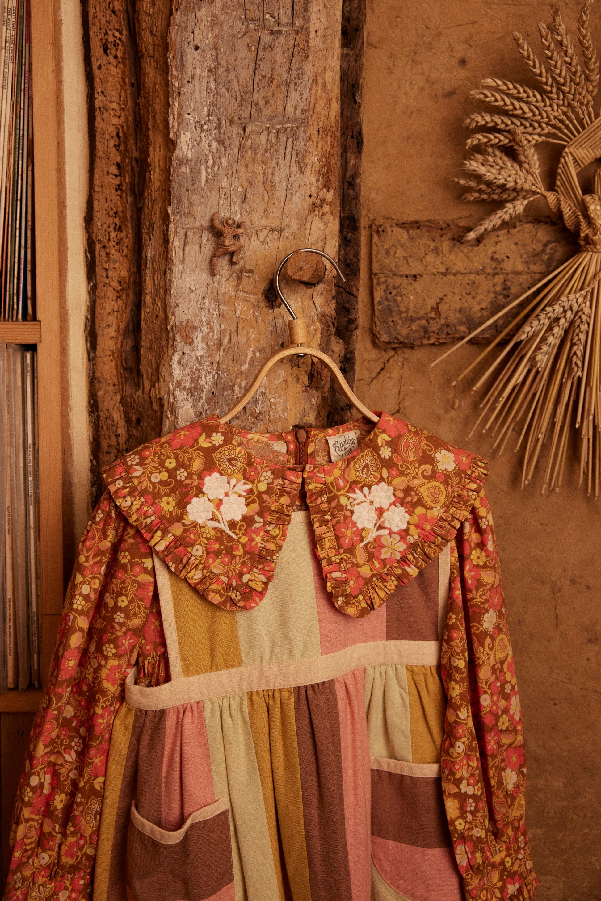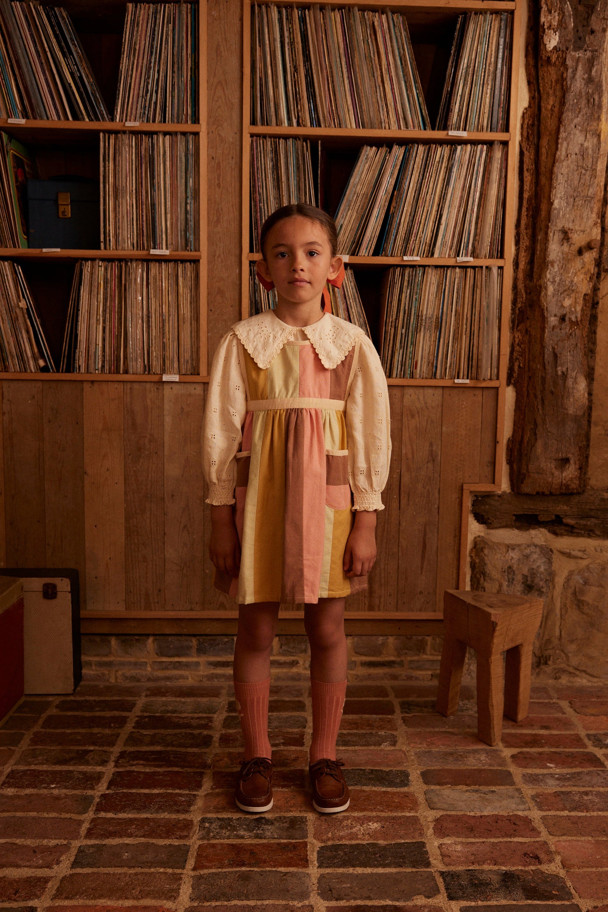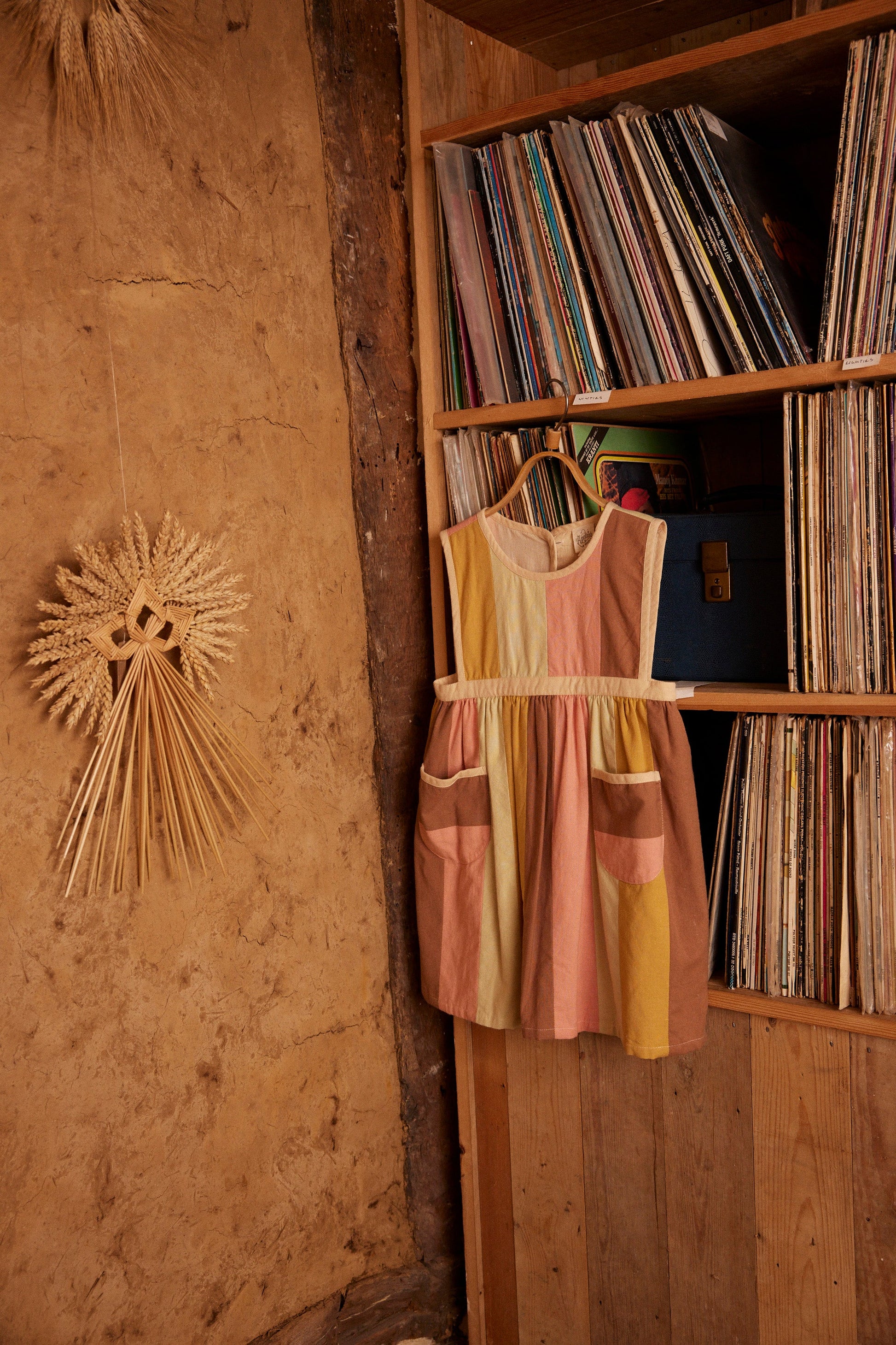 Our much-loved Bibi pinafore returns with special, fully patchworked stripes in the season’s rustic cotton-linen fabrics. Featuring sweet patch pockets, contrast binding at bib, back neck button and invisible zip and button at centre back waist. Bibi’s high empire line makes her the prettiest piece for layering – we love her worn over knits, jersey layers or one of our blouses for occasions. 85% Cotton 15% Linen (Rustic Cotton-Linen) Ethically made in India Hand wash recommended 2-3 years. Dress length is 53cm 3-5 years. Dress length is 56cm 5-7 years. Dress length is 62cm 7-9 years. Dress length is 68cm * Arianah in the studio shoot imagery is 126cm tall and wearing a 5-7y sample