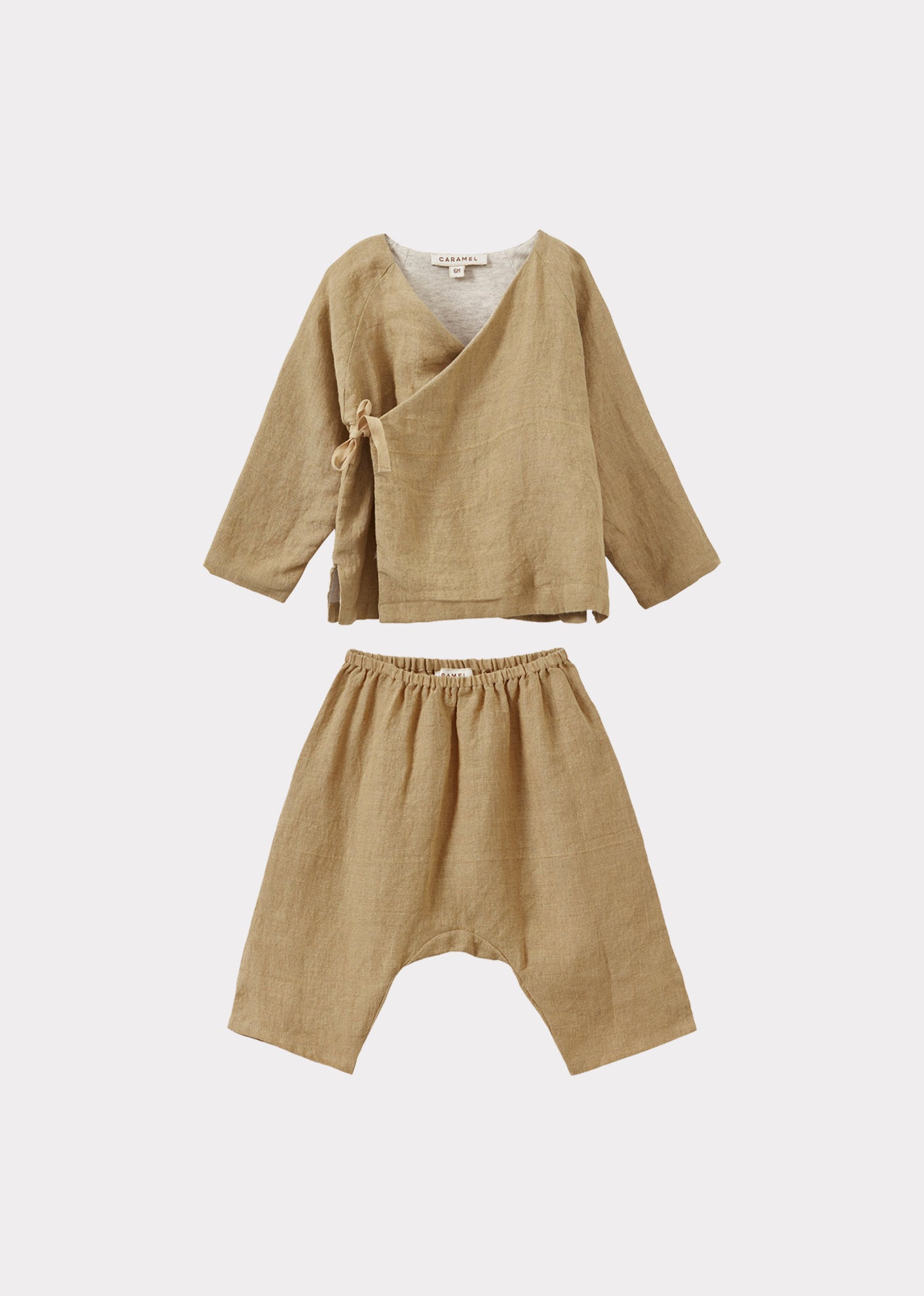 Our Pochard baby set is crafted from light-weight linen fabric and a rich mustard hue which is perfect for the seasonal change. The wrap-front top is lined with cotton jersey for extra comfort and secures with charming ties. Complete with our signature baby trousers, designed to offer perfect fit for growing legs, this set is ideal for both lounging and playing.