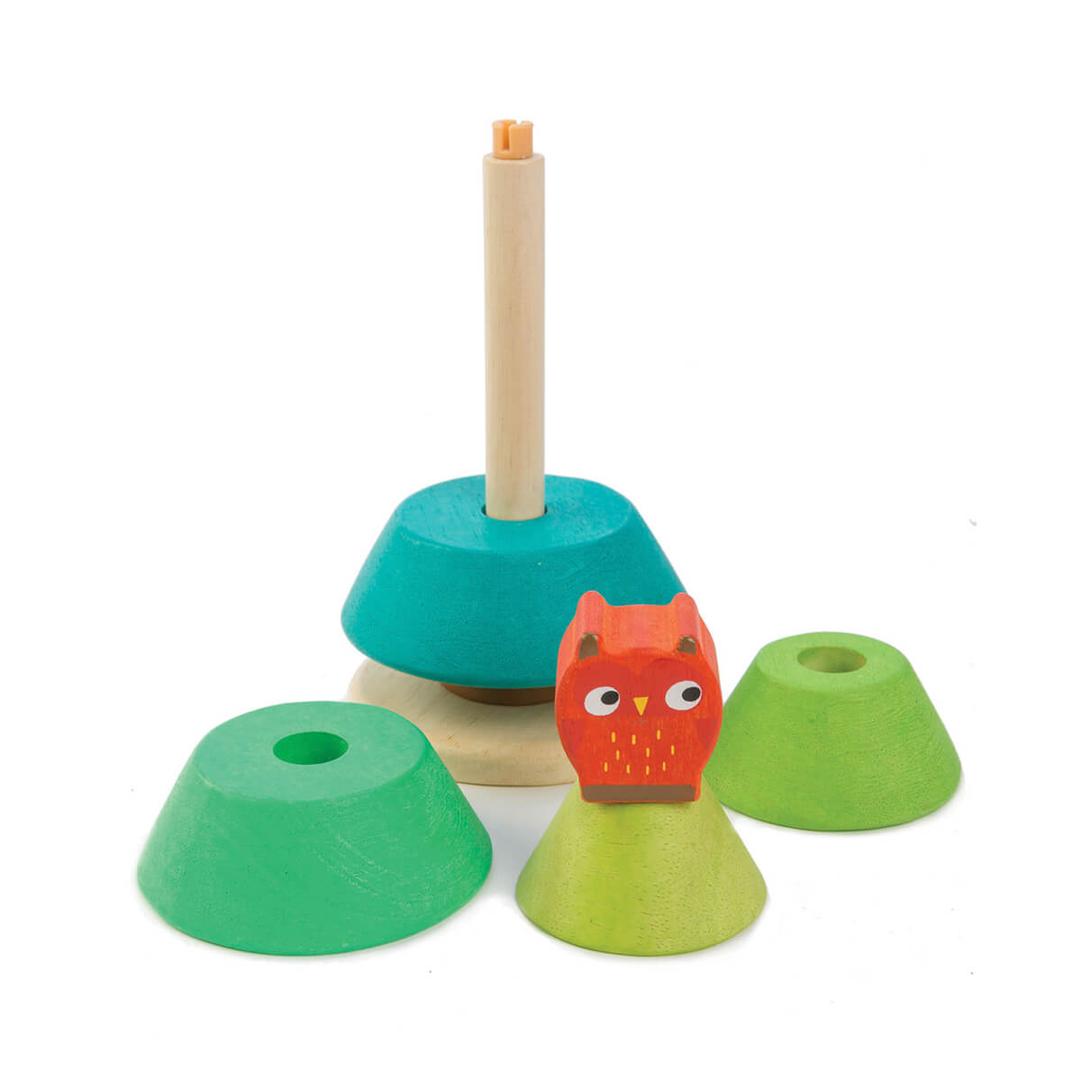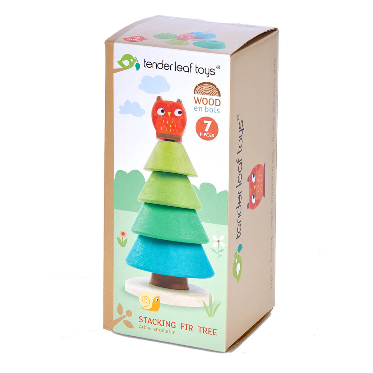 Stacking Fire Tree by Tender Leaf Toys. A beautiful luscious green fir tree to stack and then top off with an owl! Base with flexi pole, 4 stacking rings, and a bird Made from sustainable rubberwood, coloured with a soft non-toxic waterstain for a contemporary style. Presented in an illustrated colour box. 9cm x 9cm x 18.5cm. Recommended for 18 Months+.