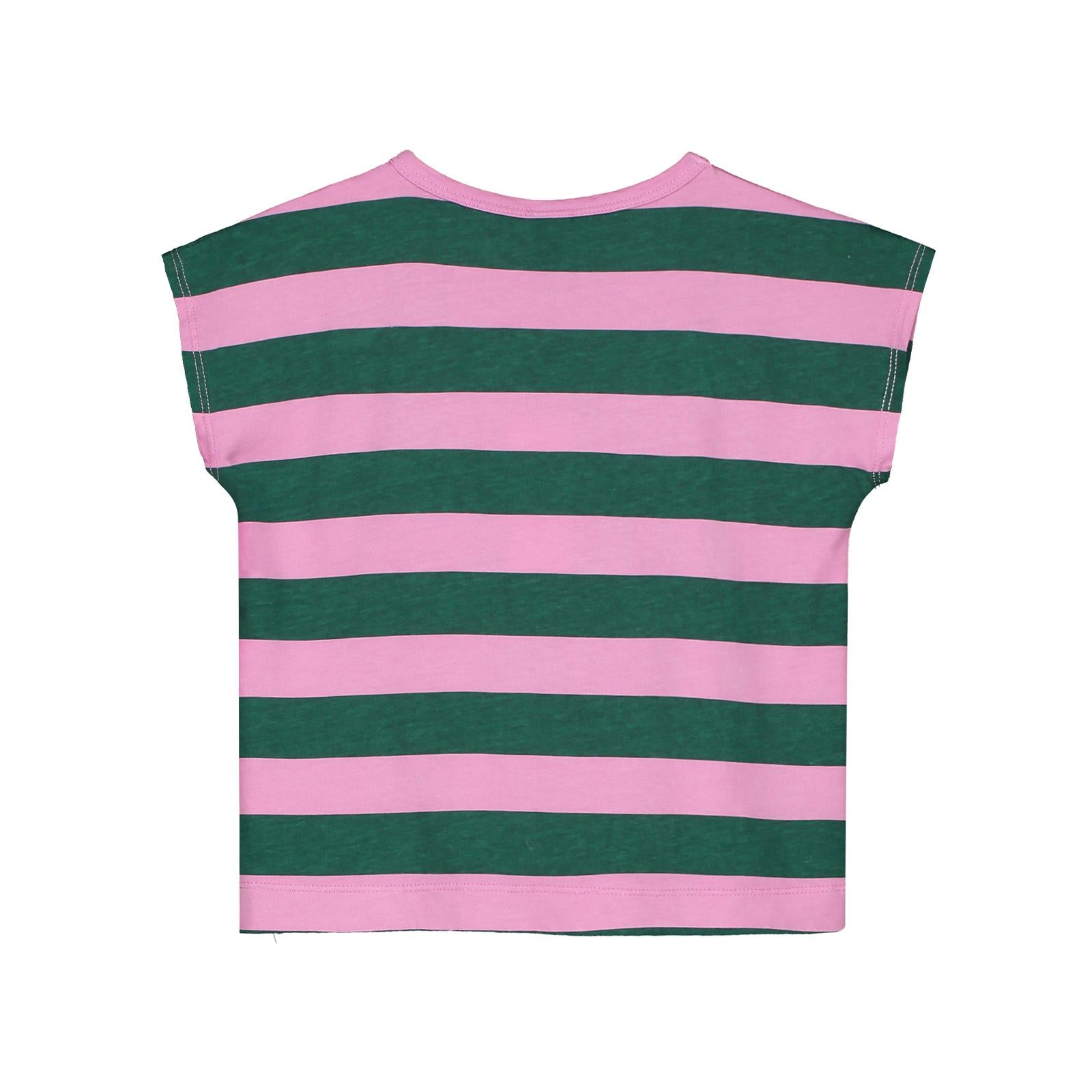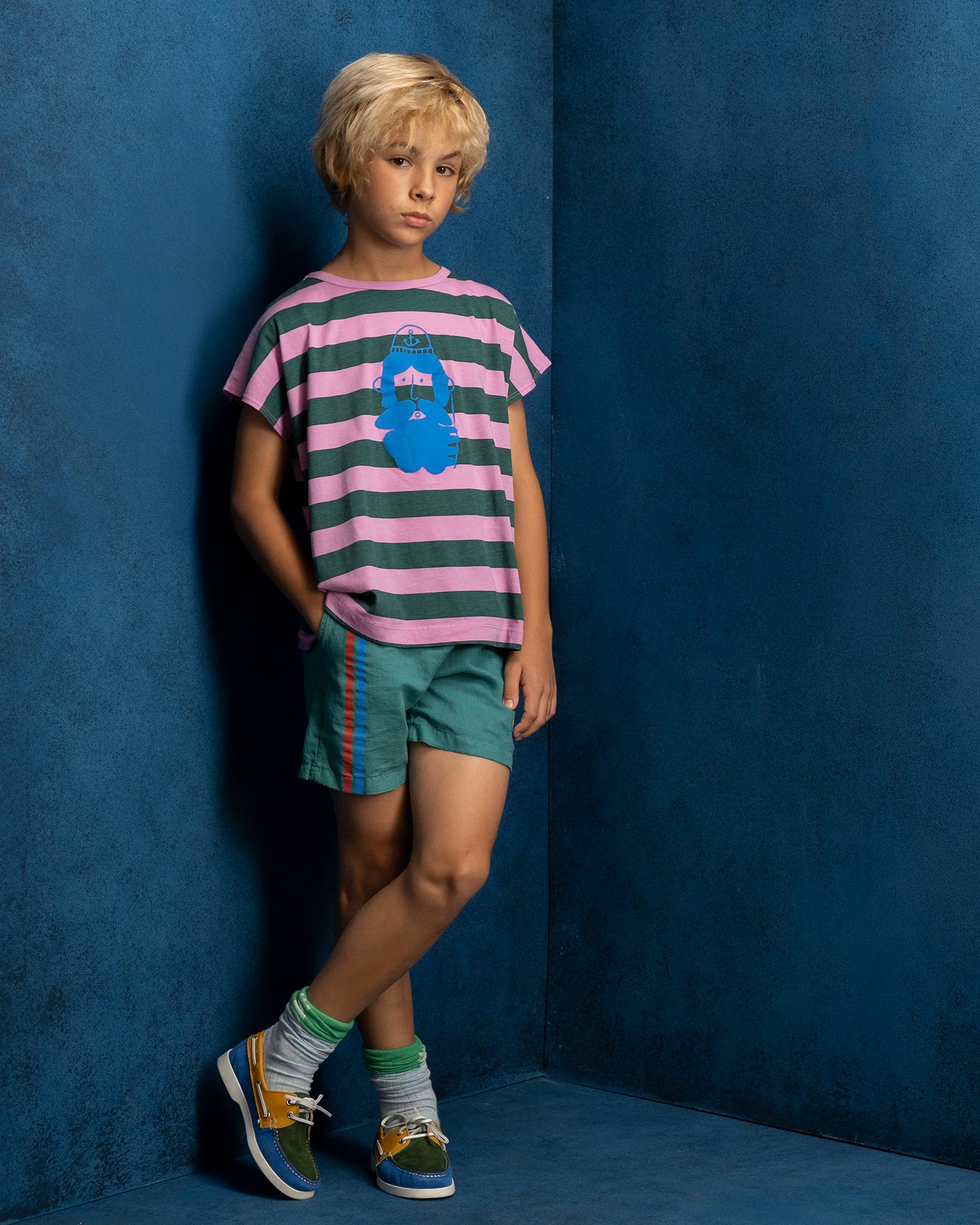 Round neck short sleeve all over wide stripes and front captain print.
