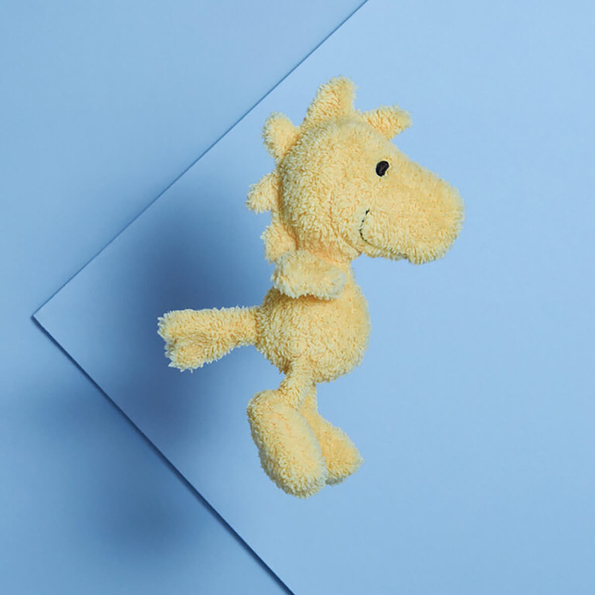 Snoopy toy by Bon Ton Toys. We have adopted a little Beagle called Snoopy and his little yellow friend Woodstock. Terry is a beautiful, soft fabric. It feels so comfy and snug, it's impossible not to like. Little Woodstock here is the snuggliest little bird. He'll fly right into your arms! All Peanuts plush items are hand made and contain 100% recycled polyester filling. All our suppliers are carefully selected and all meet the “ethical supply chain” (ICTI) status.Bon Ton Toys is an internationally renowned supplier of high-quality soft and plush toys established in 1933. All their toys meet the very highest quality, safety and regulatory standards. 6" / 15cm tall. Colour: Yellow. 100% Polyester. CE Certified. Suitable for ages 3+. Product code 33170002